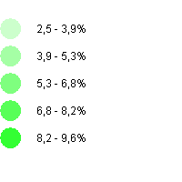 Durch Mausklick auf die gewünschte Partei wird der Stimmenanteil in % durch farbliche Abstufung in der Karte dargestellt.