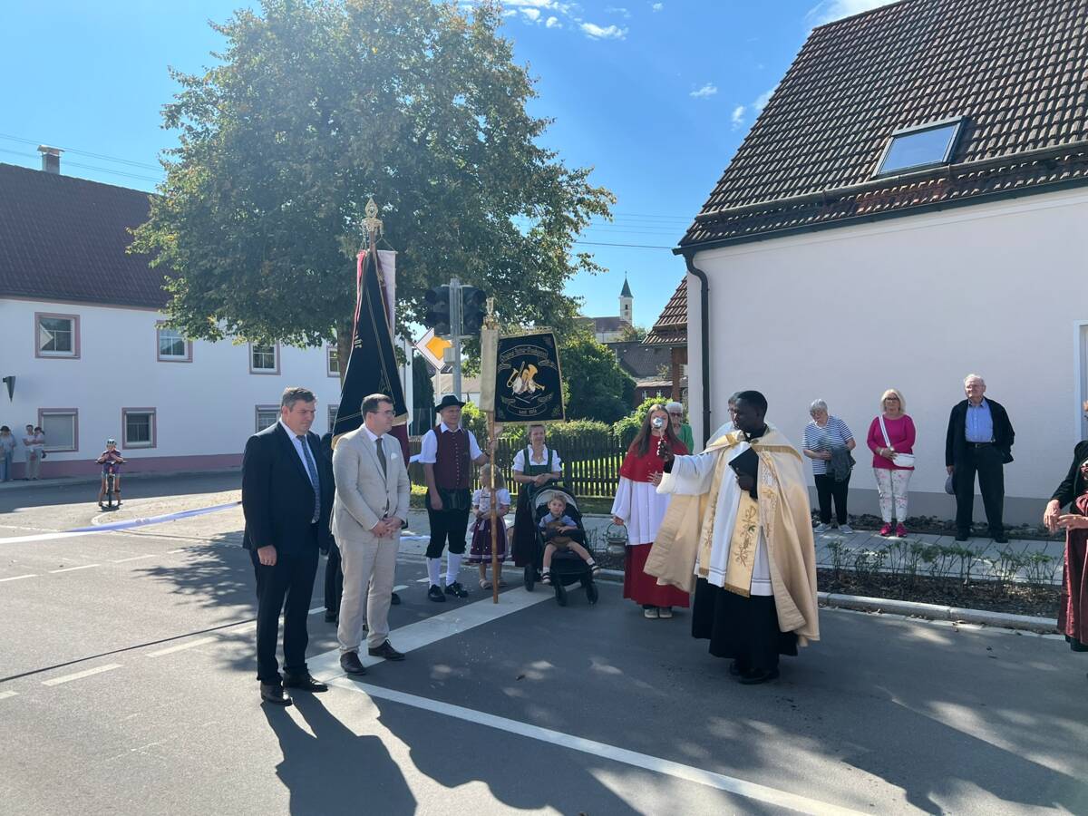Gefeiert wurde die Verkehrsfreigabe mit einem Wortgottesdienst am Vormittag in der Pfarrkirche St. Martin in Zöschingen. Anschließend segnete Pfarrer Noah Ijabani Lucas die Straße und gab gemeinsam mit den politischen Vertretern den Verkehr frei. Der Musikverein Zöschingen umrahmte den Akt feierlich und sorgte auch, gemeinsam mit dem Reitverein und der Freiwilligen Feuerwehr, für das leibliche Wohl.